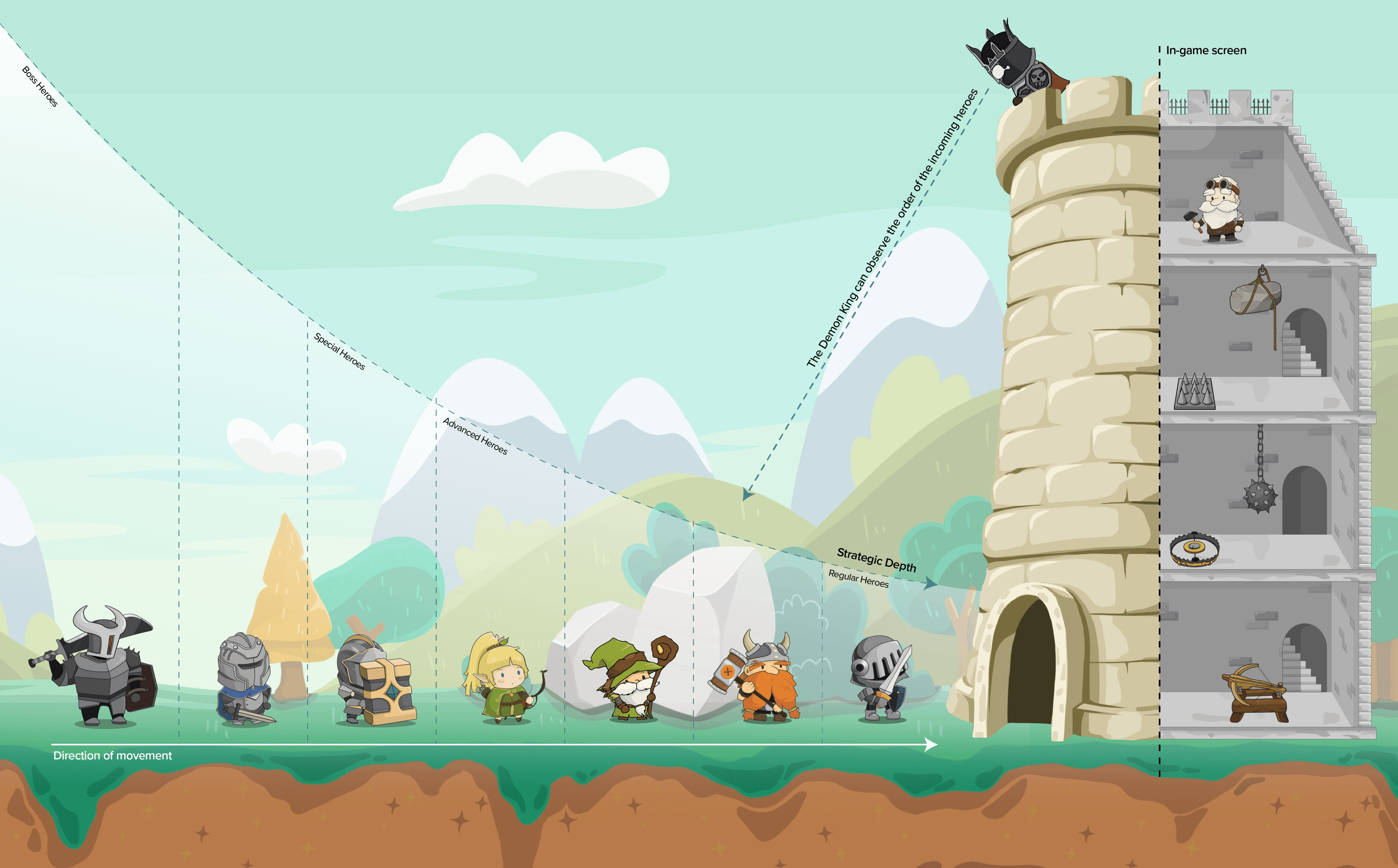 The player becomes the Demon King who must defend the tower from the invading heroes(enemies). Different heroes(enemies) appear in each stage, climbing the tower toward the Demon King(player) on the top floor. The player must install traps and use skills in the tower to defeat the heroes, preventing them from reaching the top floor.