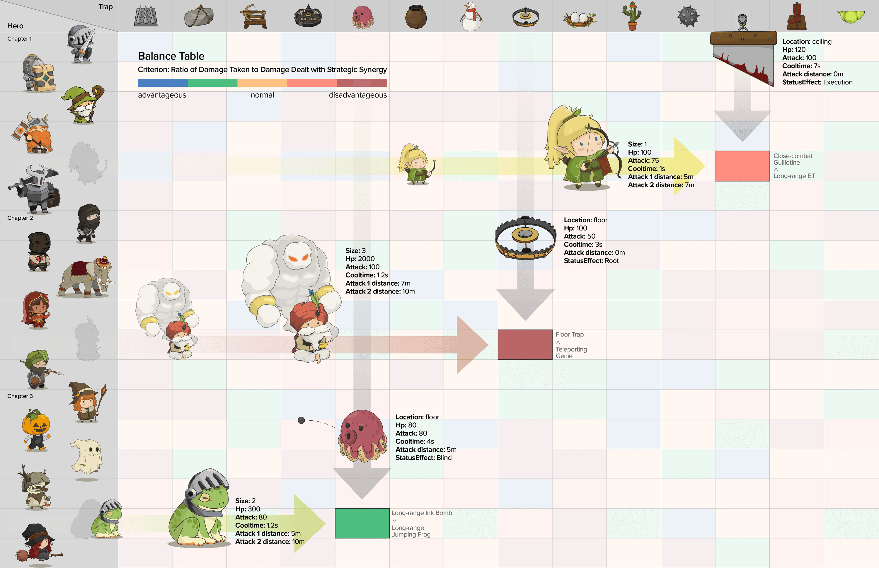 Each trap has unique properties, requiring players to strategically position them based on hero types. Factors such as range, ability, and placement create dynamic interactions—for example, elves can destroy ceiling traps but cannot attack floor traps. This system encourages players to diversify their strategy rather than relying on a single trap type.