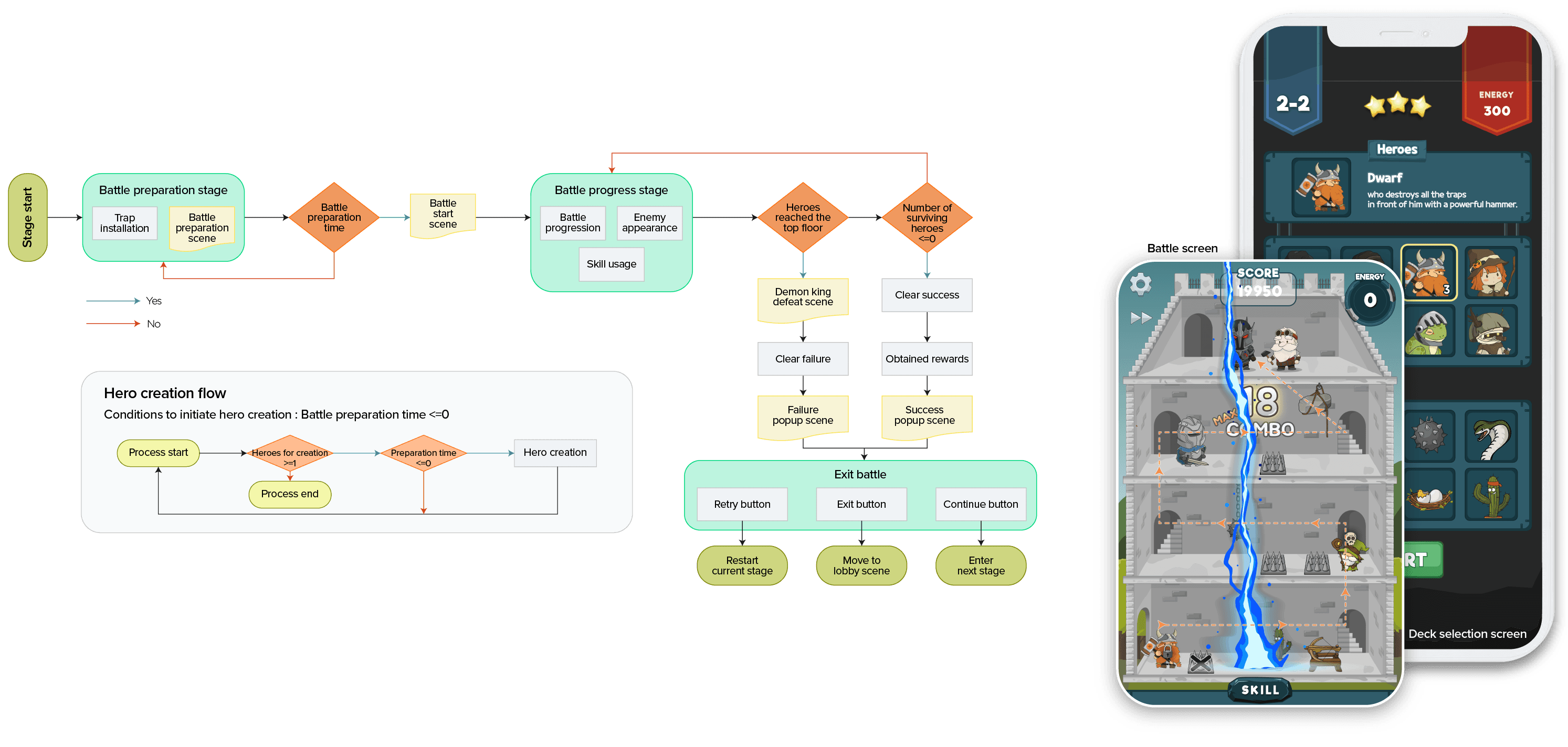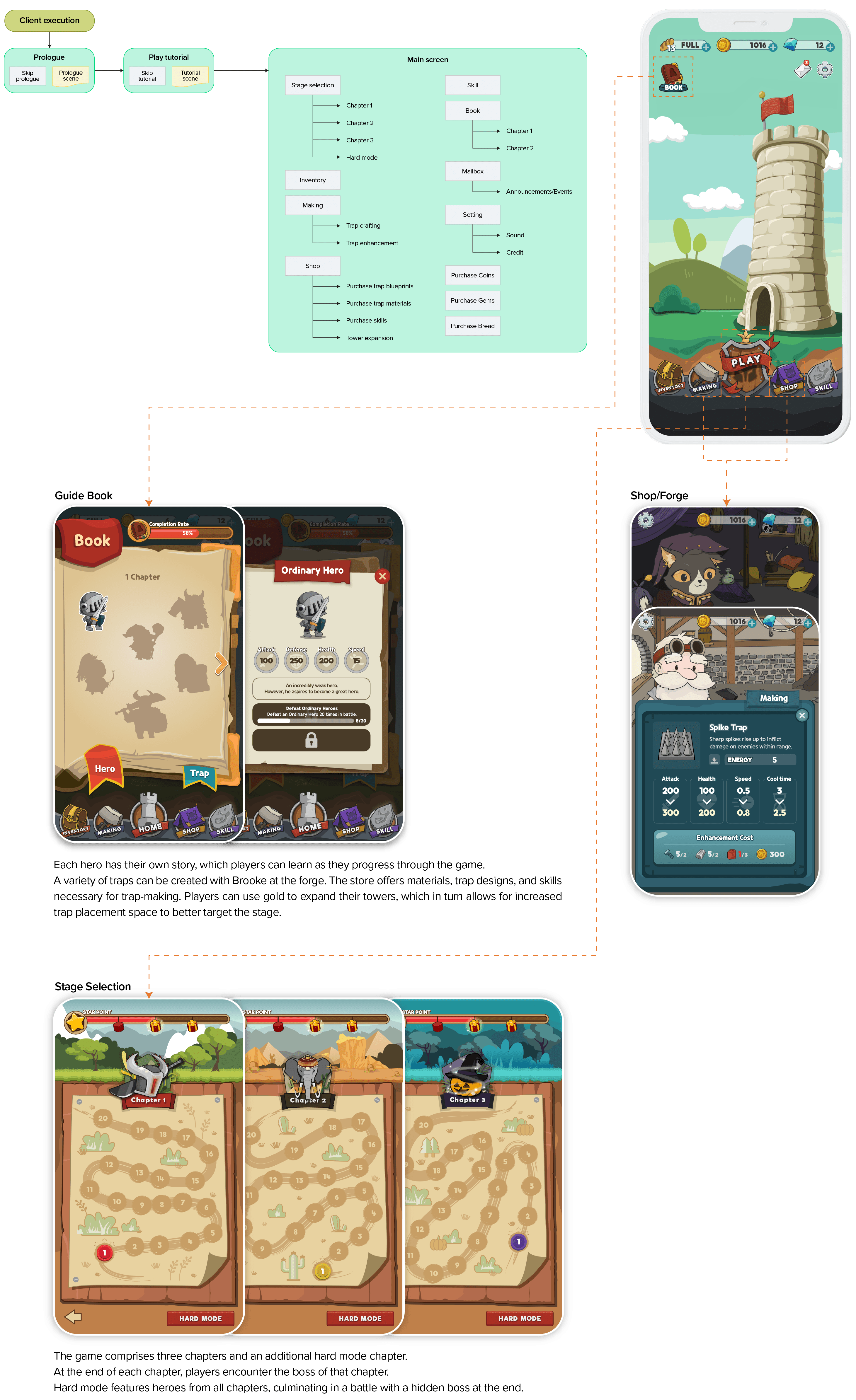 The game is strongly characterized by strategic and clicker elements. Since the order of the heroes' appearance is a key to the strategy, players must check the hero wave in advance, predict the battle pattern, and place traps accordingly. Additionally, players attack heroes by directly clicking on traps to activate them, enhancing the tactile enjoyment suitable for a mobile platform. This design leads players to experience more intense and speedy gameplay.