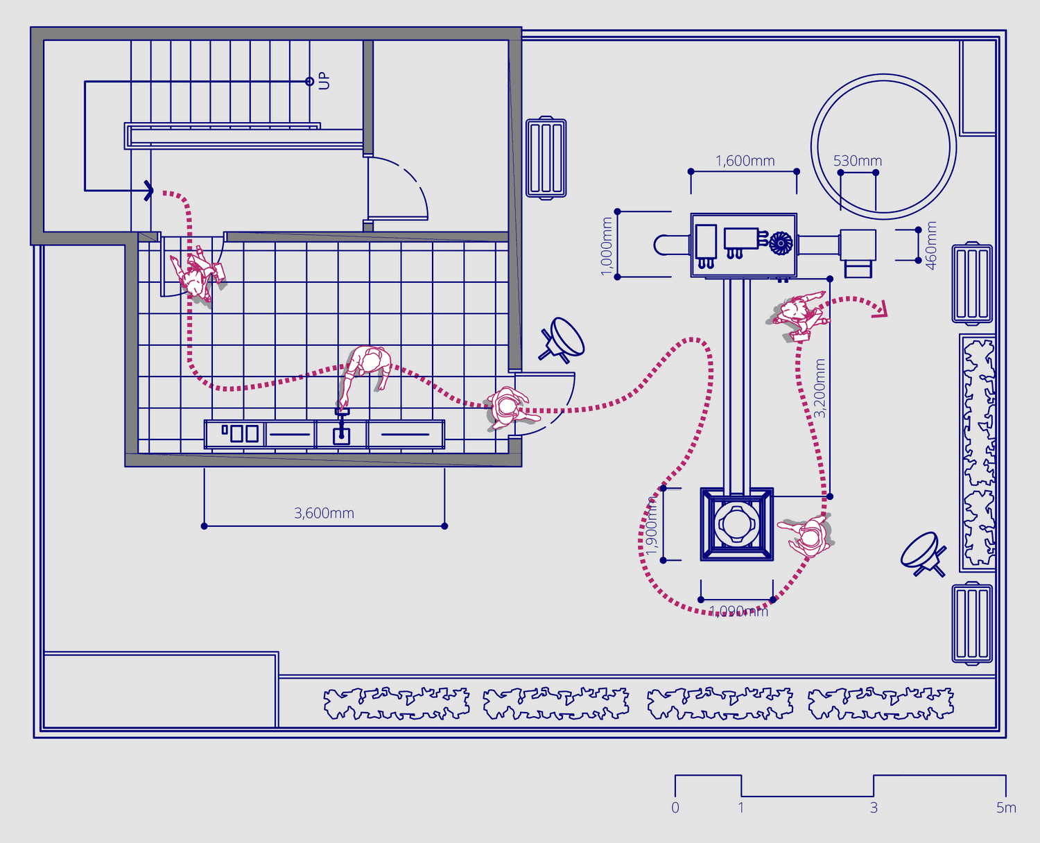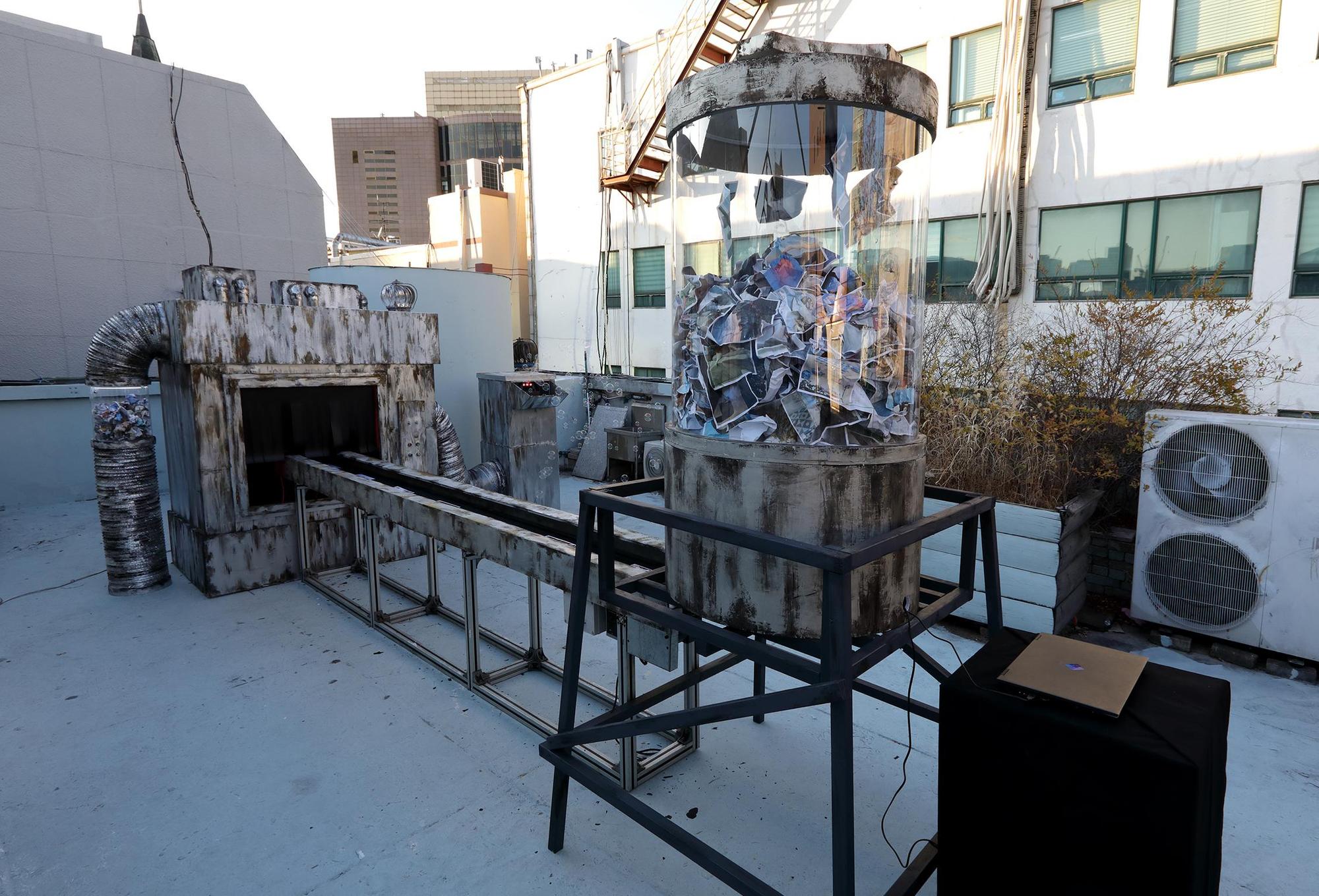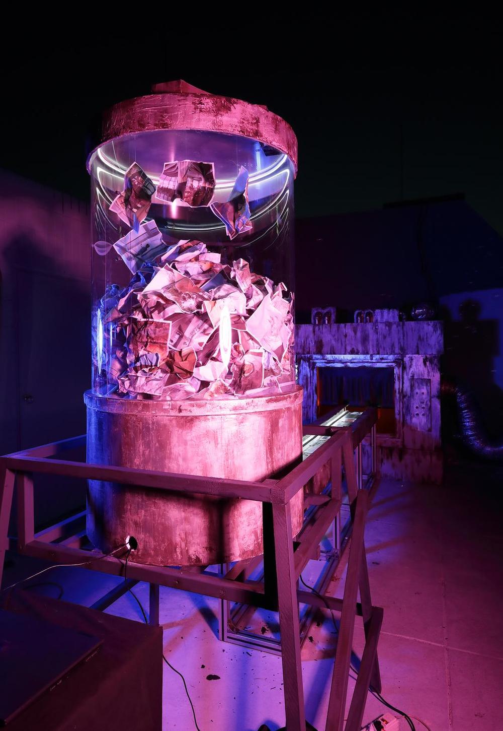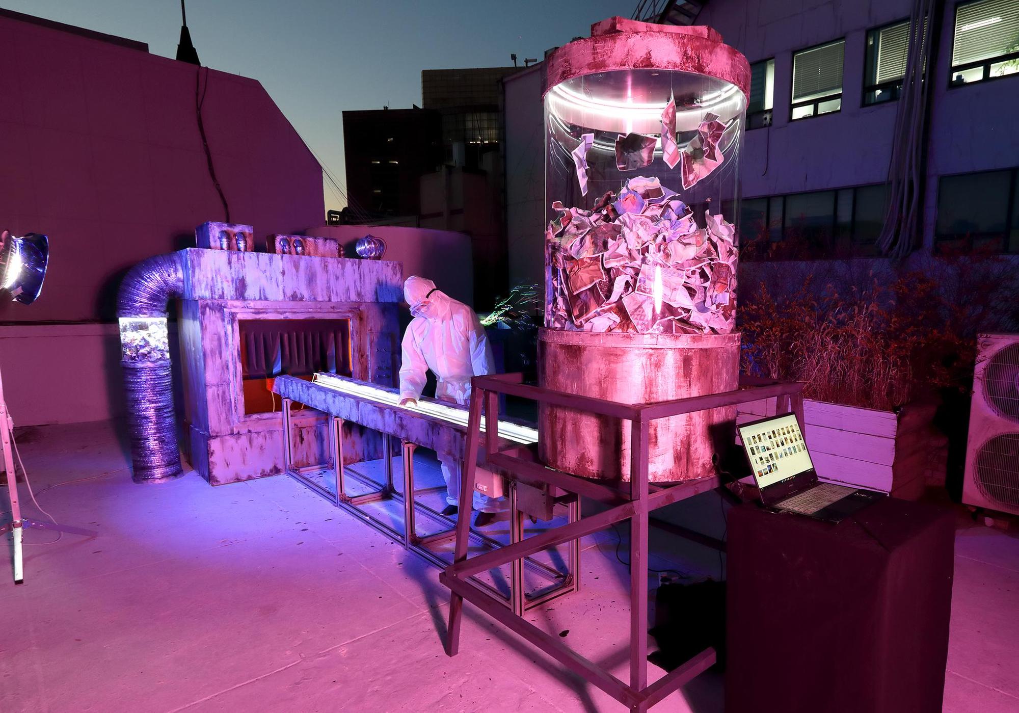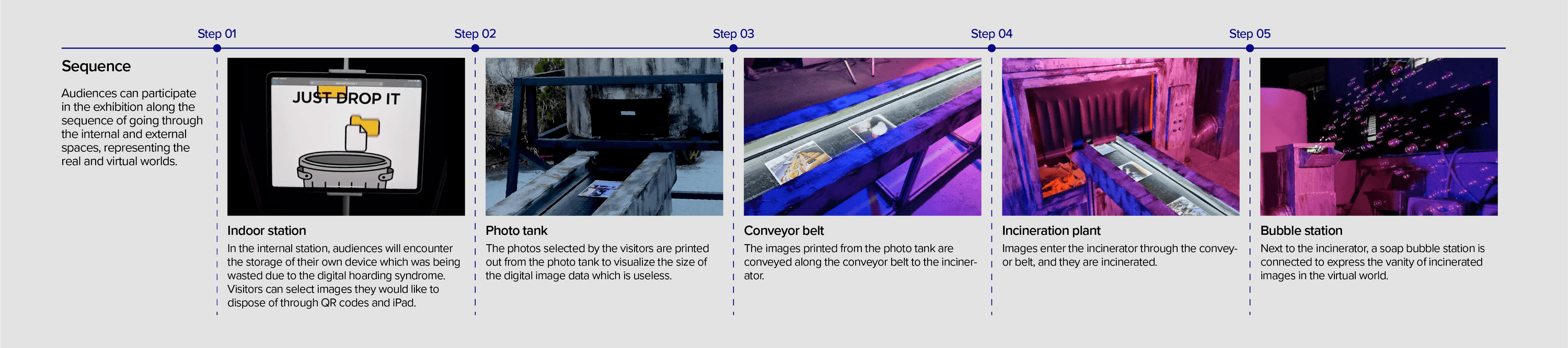 This exhibition has two different spaces: an interior space & an exterior space. The audience can send their photos through the station inside and then face the outside digital incinerator. They can look around from the photo tank to the conveyor belt and incinerator to witness the process of burning out their data.